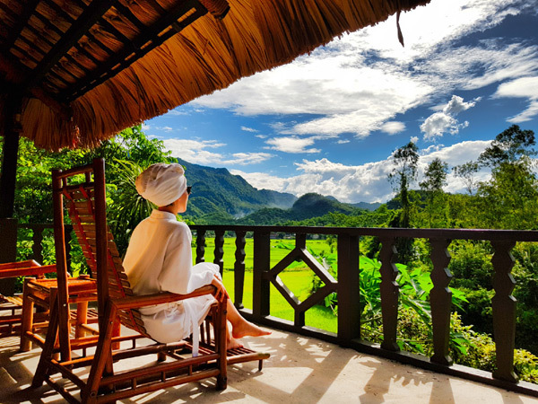 Sitting atop a private hill in Na Phon village, Mai Chau Ecolodge is the most secluded haven in Mai Chau with a stunning backdrop of lush rice paddies and emerald mountains embraced by clouds.